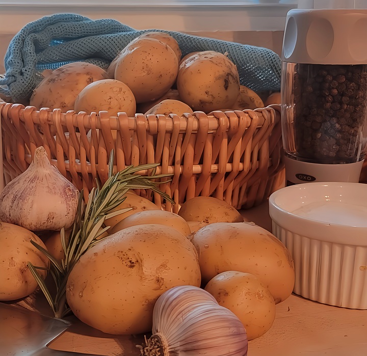 The proliferation of choices available in almost every supermarket has made baby potatoes somewhat commonplace. Even different colors and heirloom varieties can be picked up quite readily. We chose to use a Yukon gold variety, as we have found that is what grows best for us here in our garden, but by all means, any small variety can be used to great effect. Potatoes with different levels of starh and water will cook a little differently, but the results will still be delectable no matter what.